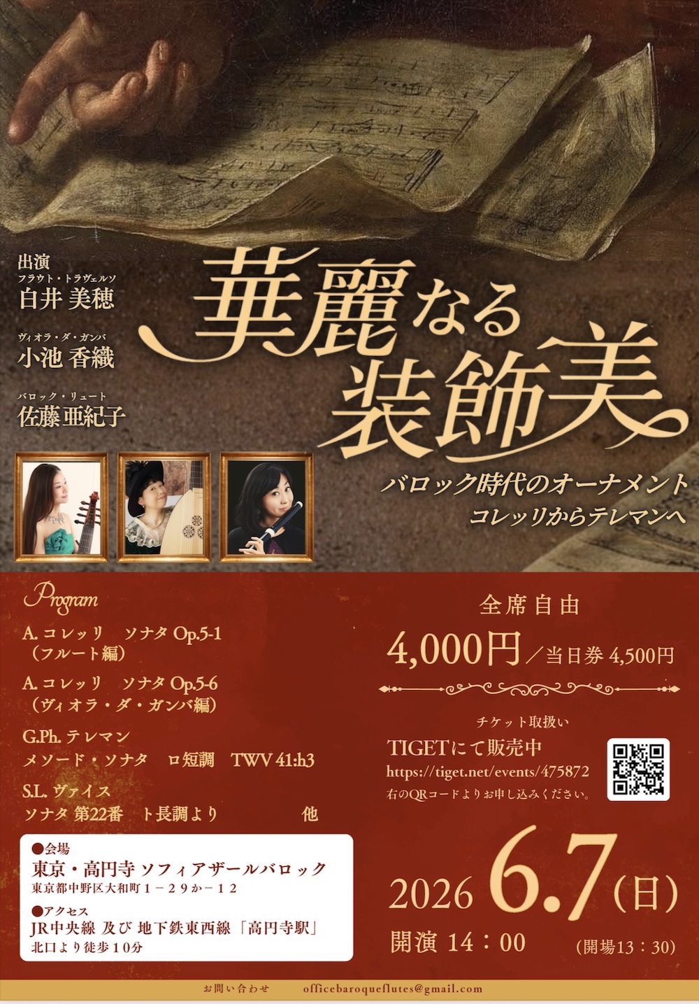 バロック音楽において、旋律はそのまま演奏されるだけでなく、装飾(オーナメント)によって豊かに彩られてきました。本公演では、アルカンジェロ・コレッリやゲオルク・フィリップ・テレマンの作品を通して、「音をどう飾るか」というバロック音楽の醍醐味をご紹介いたします。演奏とともに聴きどころもお伝えしながら、18世紀の美意識に触れ、バロック音楽の美の核心へと迫ります。